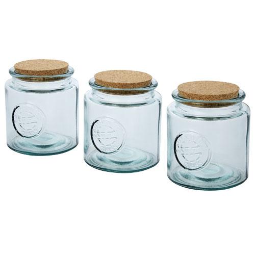 3-piece recycled glass set featuring three 800 ml jars with cork lid. Made from 3 glass bottles. Recycled glass is manufactured using less energy, raw material, and additives, than what is required for making traditional glass. Jar size: height 13 cm, diameter 12 cm.
