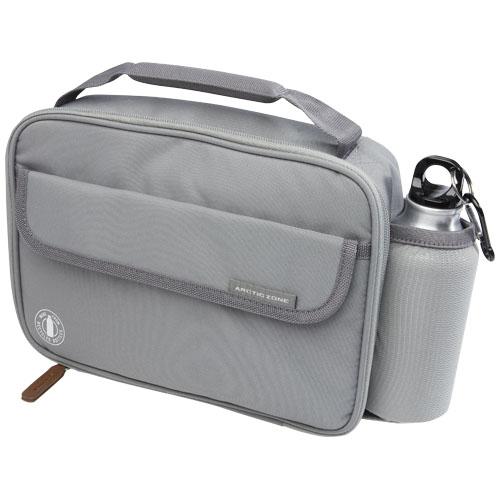 Lunch cooler bag from Arctic Zone® with the exterior made from recycled plastic bottles. Features an insulated, zippered main compartment that is large enough for reusable lunch containers or bento boxes. Also featuring a side mesh pocket, a padded handle on the top, and a front pocket with hook & loop closure. The interior of the bag features high density thermal insulation.