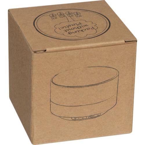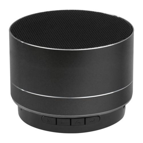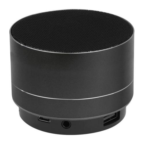 Difuzor Bluetooth din aluminiu rotund cu baterie încorporată, radio integrat, slot pentru o cartelă TF şi lumină LED intermitentă pe partea inferioară. Cablul de încărcare micro USB este inclus.