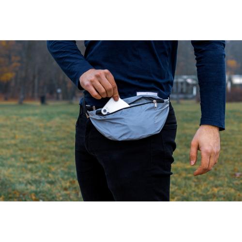 Borsetă din poliester reflectorizant, cu partea interioară mare, și curea ajustabilă.