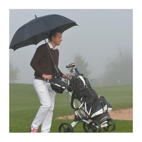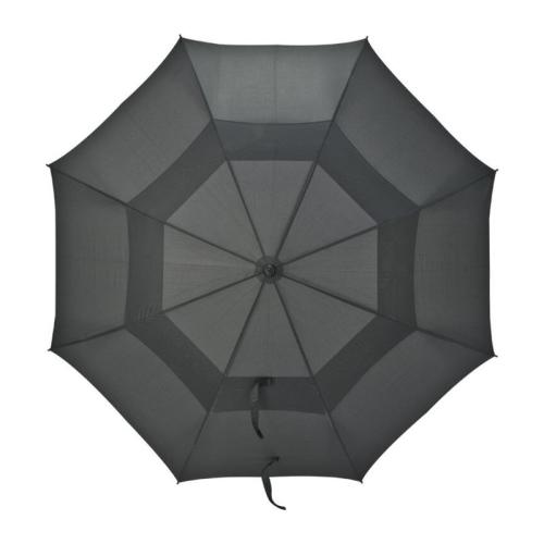 Umbrelă golf în dimensiuni XXL, antifurtună, cu partea de sus ventilată, mulţumită părţii dintre cele două materiale pongee, potrivit pentru toate cărucioarele populare de golf.