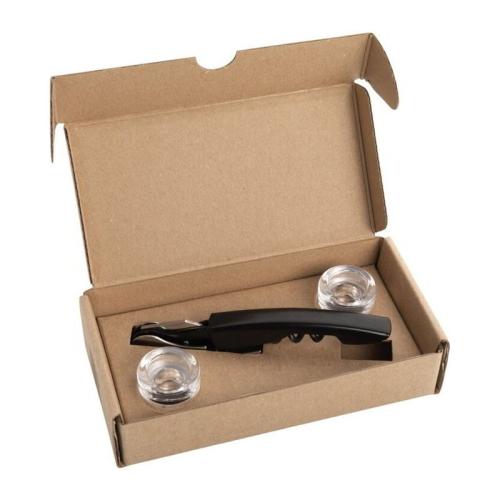 This wine set includes two glass stoppers in two sizes and a quality metal corkscrew. The stoppers are suitable for standard bottles with a slot diameters 17.5 and 18.5 mm. Packed in a Vanilla Season gift box.